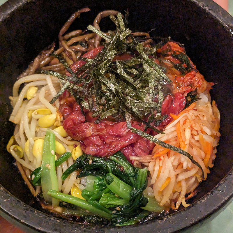 肉の存在感が大きい。勿論、存在感だけでなくちゃんといい肉を使用しているので混ぜた後の出来上がりがナムルだけの石焼ビビンバとは一線を画する。