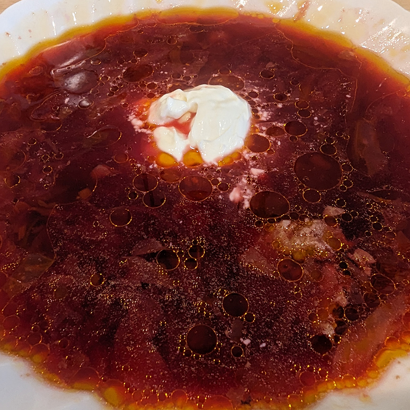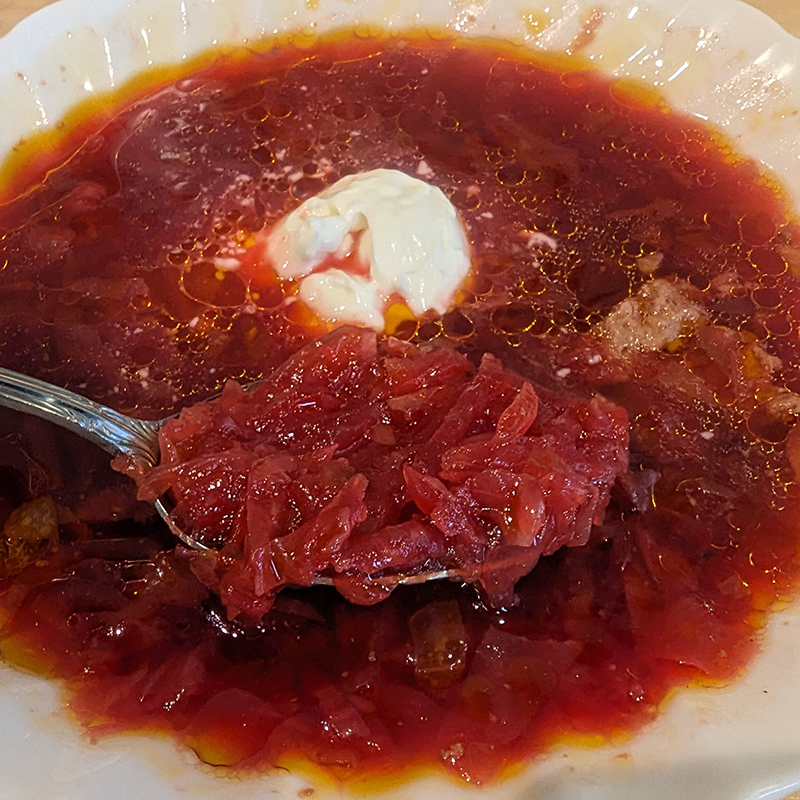 これまで頂いたボルシチは酸味が強すぎたり、癖が強いと感じるものが多かったが、全体的に優しい味に仕上がっていて、バランスがいい。サワークリームのほどよい酸味がここでも効果的に使われていた。