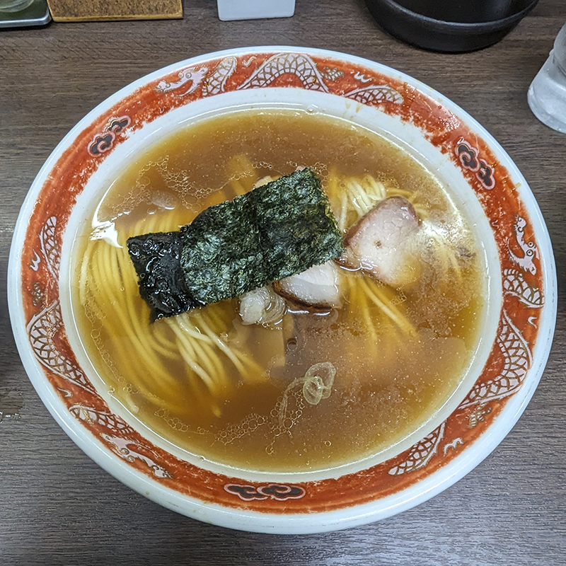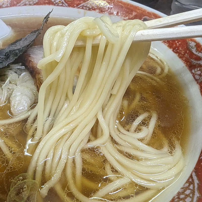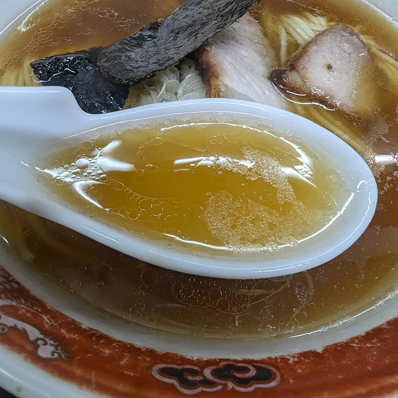スープは薄めの色合いで醤油の香りはそれほど強くないものの塩味は強い。麺とのバランスもよく往年の東京ラーメン的な赴き。