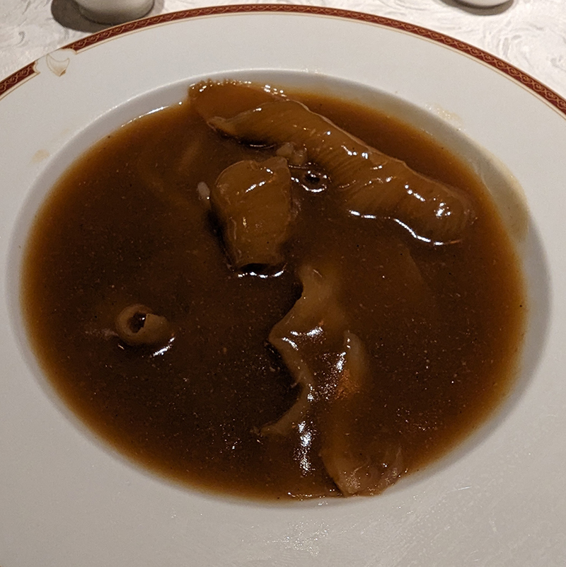 この価格のコースのふかひれなのでそこまでの上物ではないが、しっかりと食べ堪えがある。先の前菜とは打って変わり濃厚な醤油ベースソースが滋味深く、紹興酒が進む。