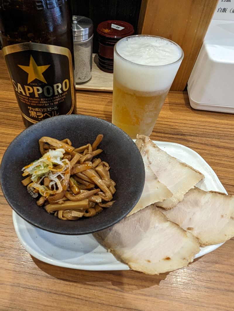 まずはトッピングのチャーシューとメンマをおつまみでラーメン前を。特におつまみとしてのメニューはないのだが、このような形で提供してくるのはありがたい。