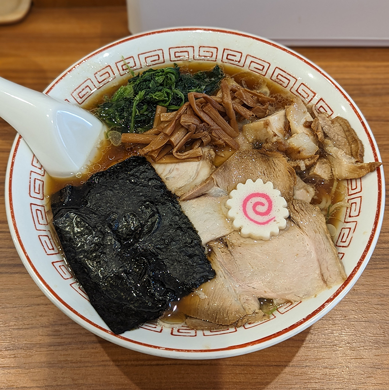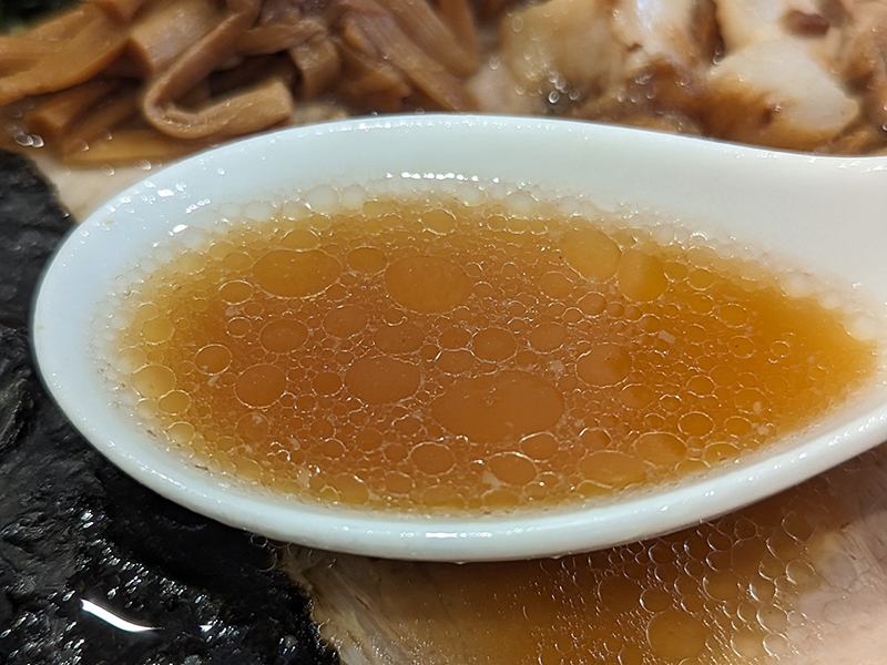 醤油の色も喜多方ラーメンに比べて明らかに濃くなるが、れんげで掬うと透明度が高く思ったほどの濃さではない。醤油の香りに下支えされたスープはウェルバランスで生姜の香りは想像よりも穏やか。