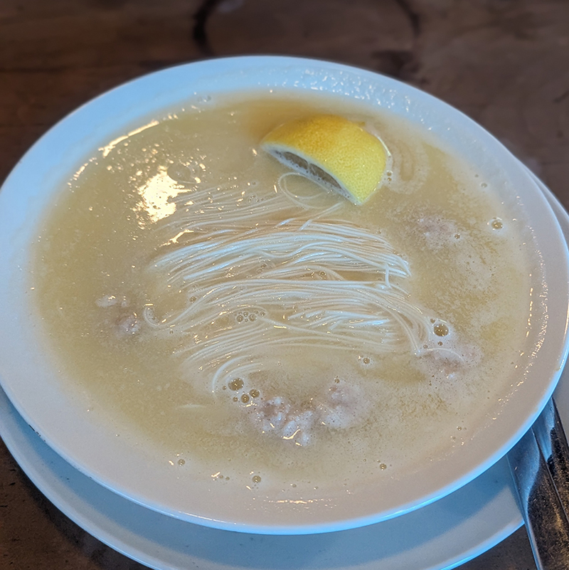 スープは鶏の旨味がたっぷりでコクがあって美味しい。麺はそうめんとのことだが、一見、九州ラーメンの麺に見えなくもない。レモンの大きな塊が入っているのが特徴で、こちらを絞りながら頂くことで味変を楽しむことができる。無くても十分に満足できるが、あればあったでレモンを絞る加減がなかなか難しい。