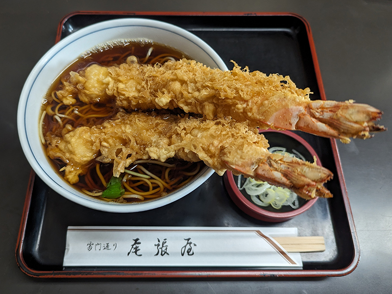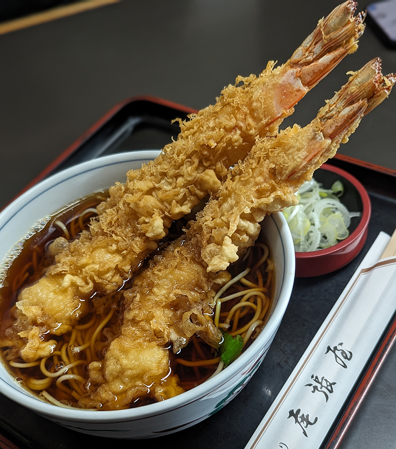 個人的にこちらのお店では温かい天ぷらそばの一択。この日は奮発して車海老を使用した上天ぷらそばを。