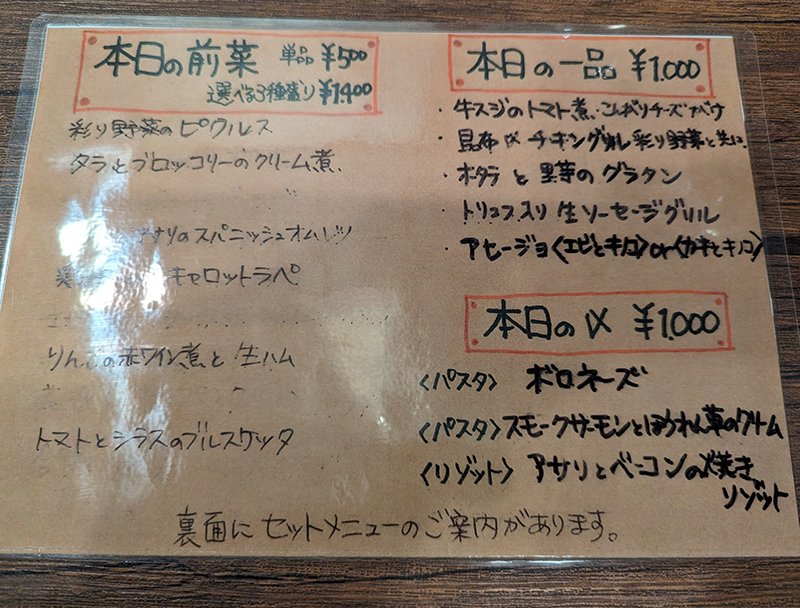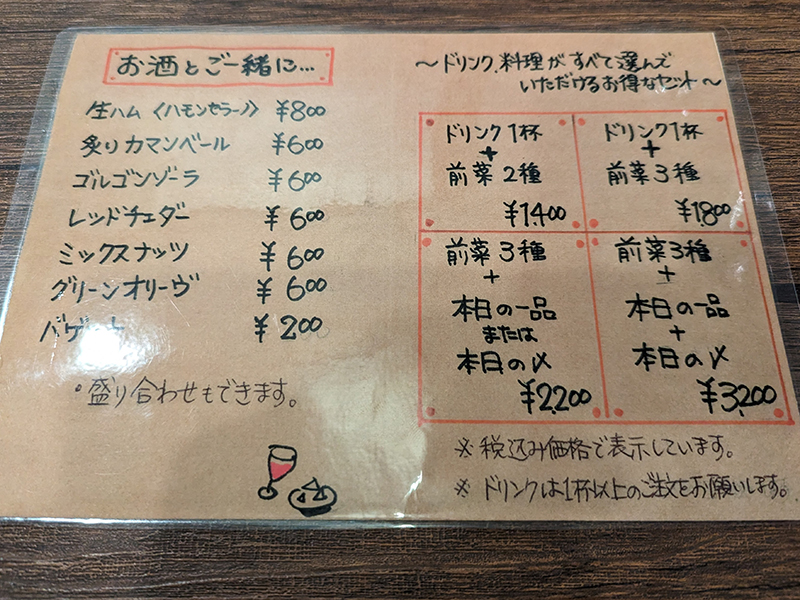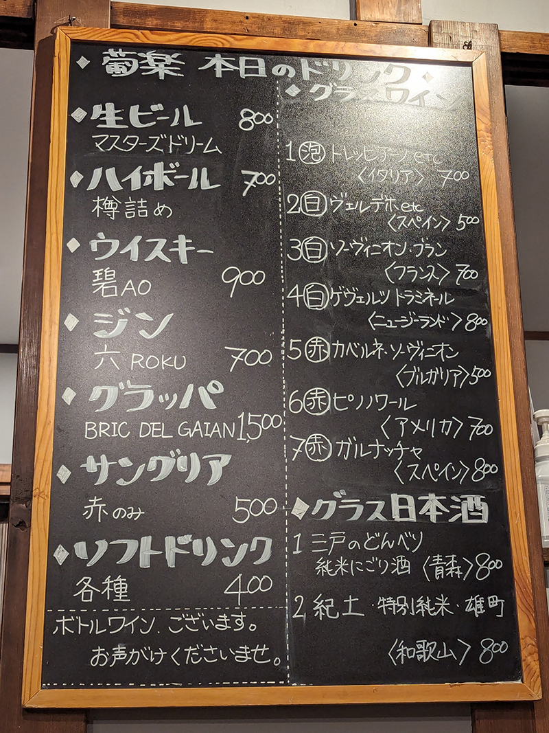 黒板に書かれた飲み物メニューを確認。ワインは前回から一部入れ替わっていた。