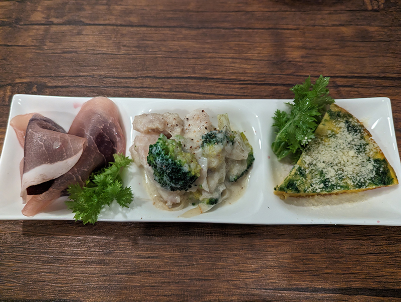 左からりんごの赤ワイン煮と生ハム、タラとブロッコリーのクリーム煮、スパニッシュオムレツの順。