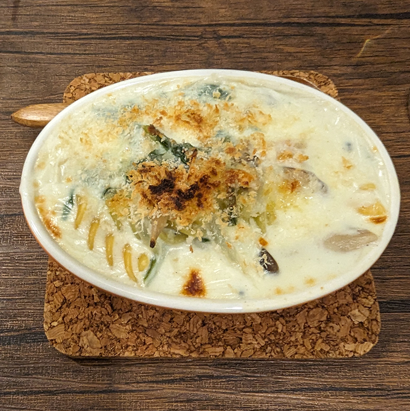 里芋にアツアツに火が入っているので温まる。味付けは少し軽めでベシャメルもさらりとしたタイプ。