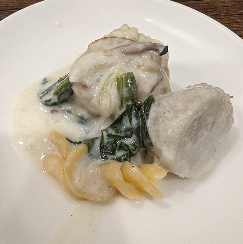 いずれもひと工夫されているところに好感が持てる。例えば、りんごは前回頂いた洋梨と生ハムのアレンジで、りんごをワイン煮にするひと手間が入ることで酸味が穏やかに。クリーム煮にタラを使用するところもセンスの良さを感じさせる。