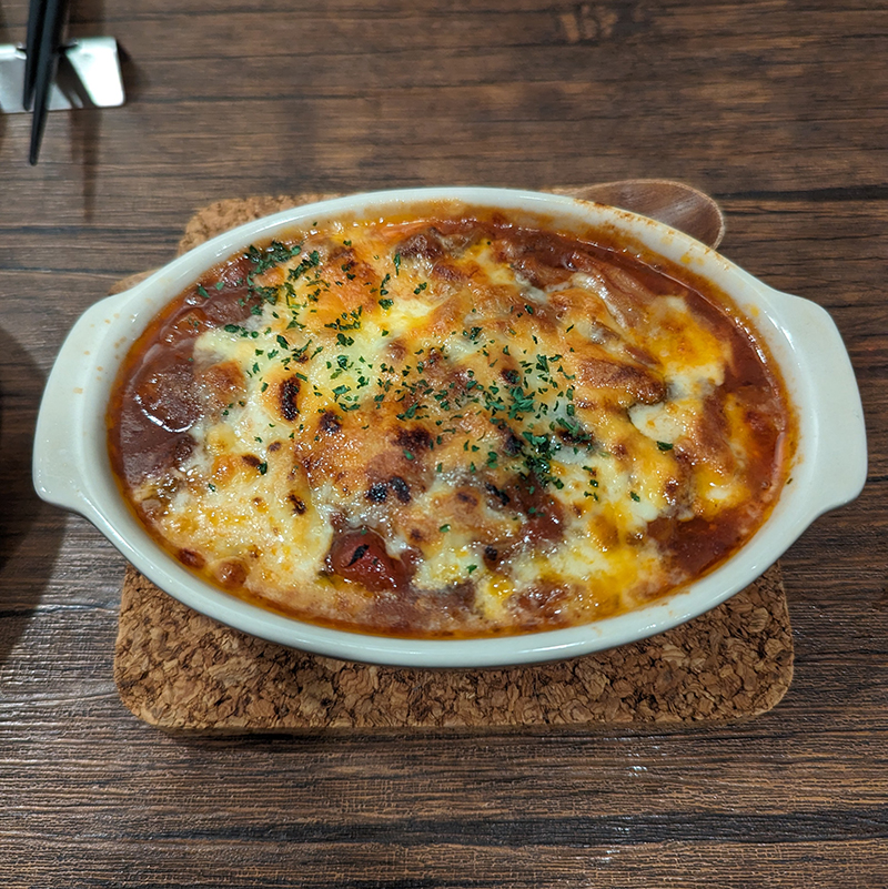 セットに単品で追加。上にチーズが掛かっていることもあってしっかりとコクがある。勿論、赤ワインのお供に最適だ。