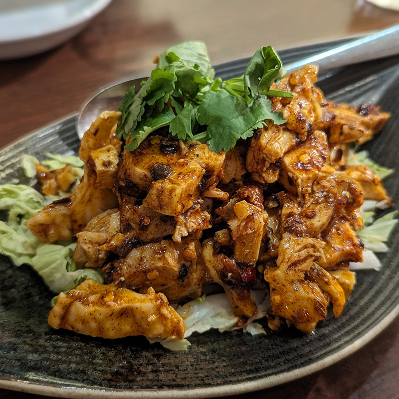 四川のよだれ鶏と比べると見た目からして違う。蒸した鶏をスライスしているのが一般的だが、こちらは細かくカットされている。更にラー油がメインでないので地味な色彩だ。見た目の印象そのままに辣よりも痺れが強い質実剛健な味わい。ひと口サイズも食べやすく味付けもしっかり。この後の料理に期待が膨らむ。