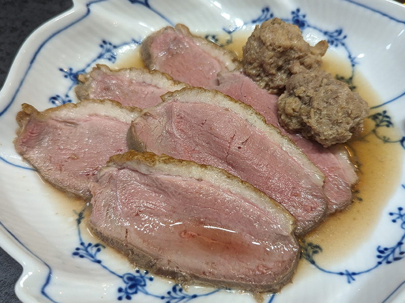 この分量でも1/3ほどだから結構食べ応えがあってお正月の間中楽しめる。薄っすらとピンク色の火加減で鴨ロース以外にもつくねが入る。肉は柔らかく上品な味付けでつくねは野趣溢れる美味しさ。これはお雑煮に入れても面白いかも知れない。