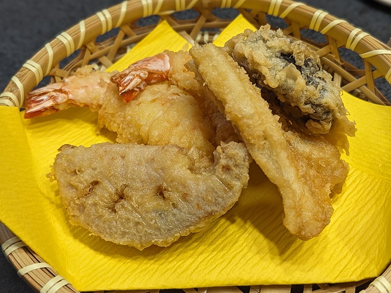 海老が二尾に穴子、しいたけ、れんこんというラインナップ。これが倍量あるので大晦日の食事はこれで間に合ってしまう。お店には予約時に来店時間の目安を伝えた上で取りに行くのだが、開店時間は集中していると見えて、店主はただひたすらに天ぷらを揚げていた。