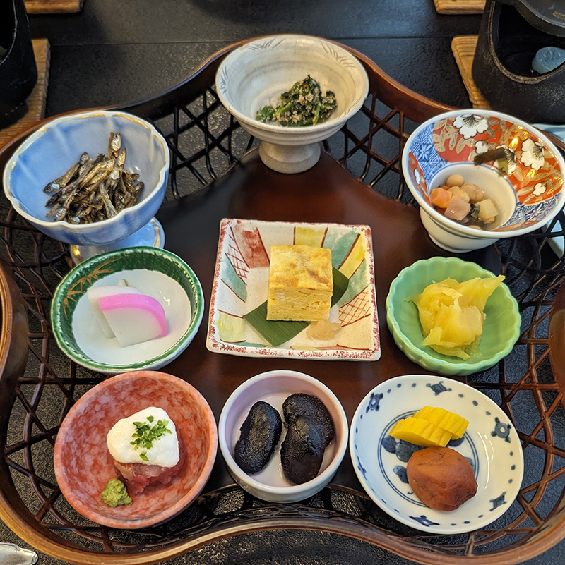 小鉢には少量ずつ料理が並び、こちらも種類が豊富。紅白の田作り、蒲鉾、お多福豆、栗きんとんなどお正月らしい品も並ぶ。