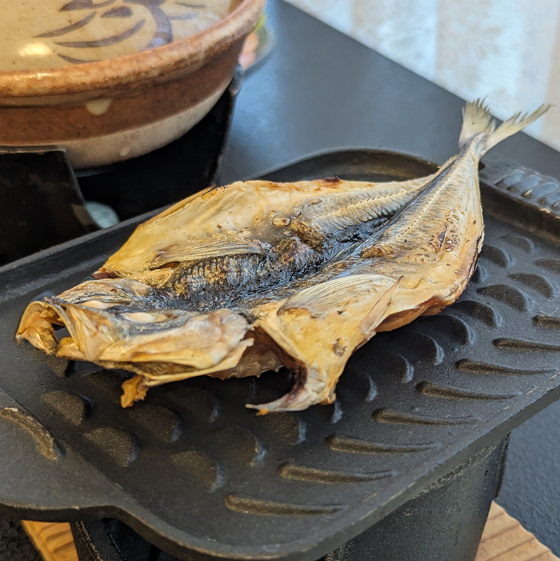 そして定番のアジの干物。目の前で軽く温めてから頂く。