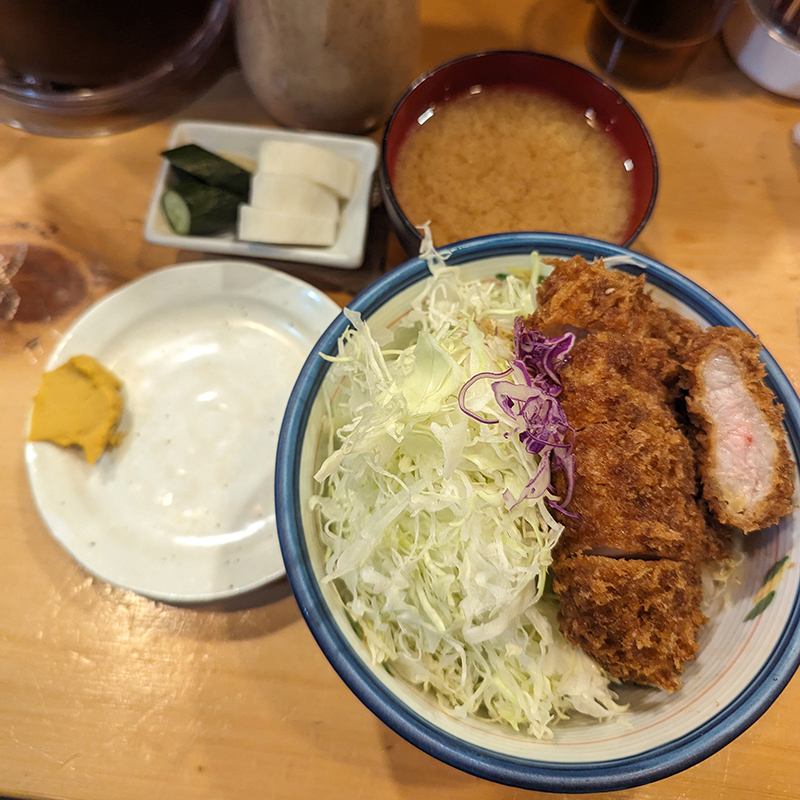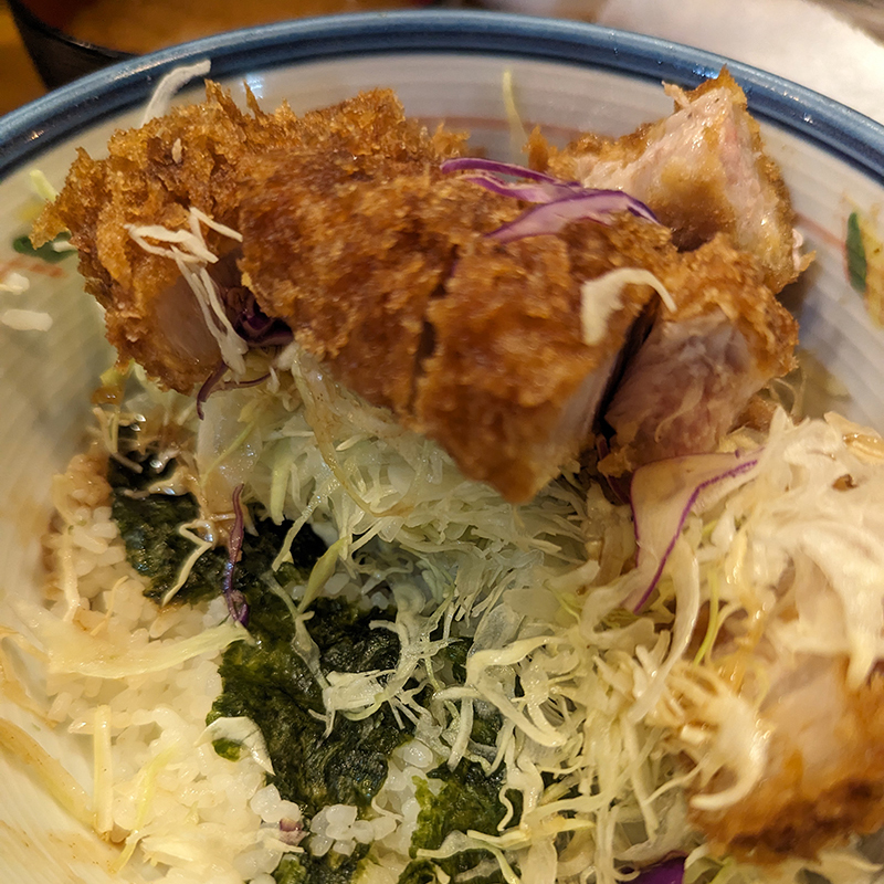 以前はキャベツの上をかつが覆っていたので、一度別皿にかつを避難させないと丼の奥には辿り着けなかった。ところが今回、丼の半分ほどキャベツの姿が見えるのでわざわざかつを逃さなくてもアプローチできる。つまり、かつがひと回り小さくなったということなのだろう。