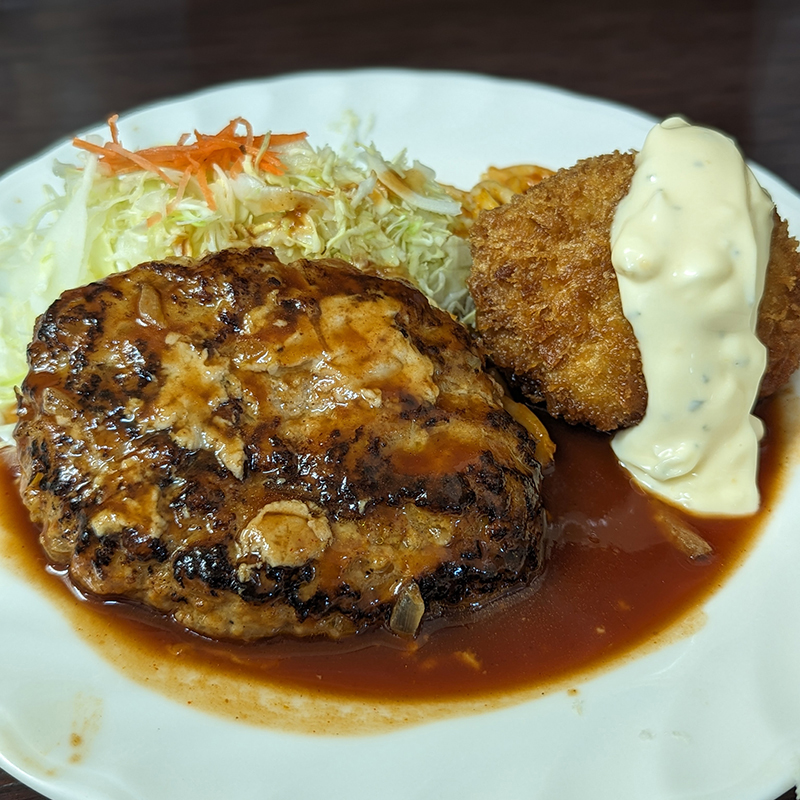 メニューはハンバーグ、カレー、揚げ物など大抵の洋食メニューが揃う。1,000円未満の料理が数多く占める。お店の看板にもあるだけにハンバーグは外せない。折角なので揚げ物も頂きたかったので盛り合わせメニューの中から選択した。