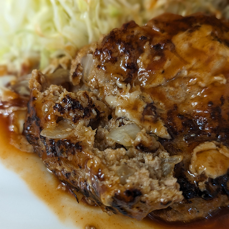ハンバーグは粗微塵の玉ねぎが入っていて、ソースはデミグラスソースと言うよりはケチャップの味が効いた中華の甘酢餡掛けに近い。