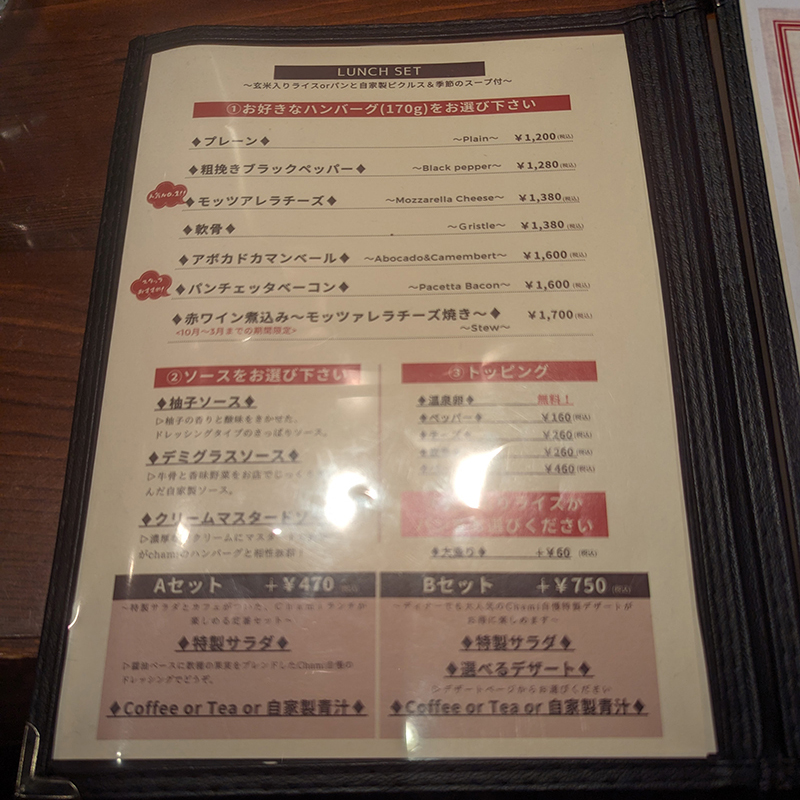 ハンバーグは岩中豚100パーセントで牛肉を期待していると肩透かしを喰らうことになる。バリエーションは豊富なのでその辺りが女性客にも人気なのだろう。注文時にメニュを選び、ソース、トッピング、ライスorパンをチョイスする。