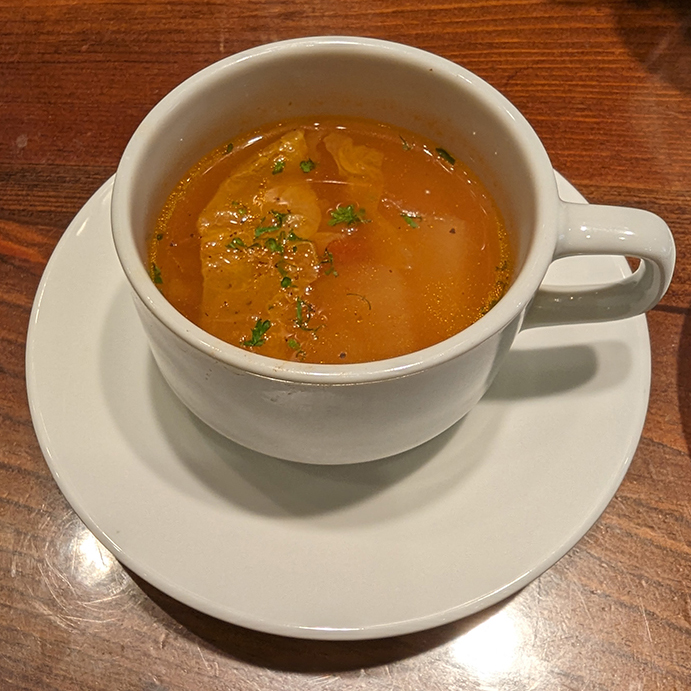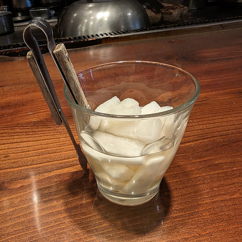 調理の様子を見ていると大根ピクルスとスープが。これのお陰で待ち時間のストレスも解消される。
