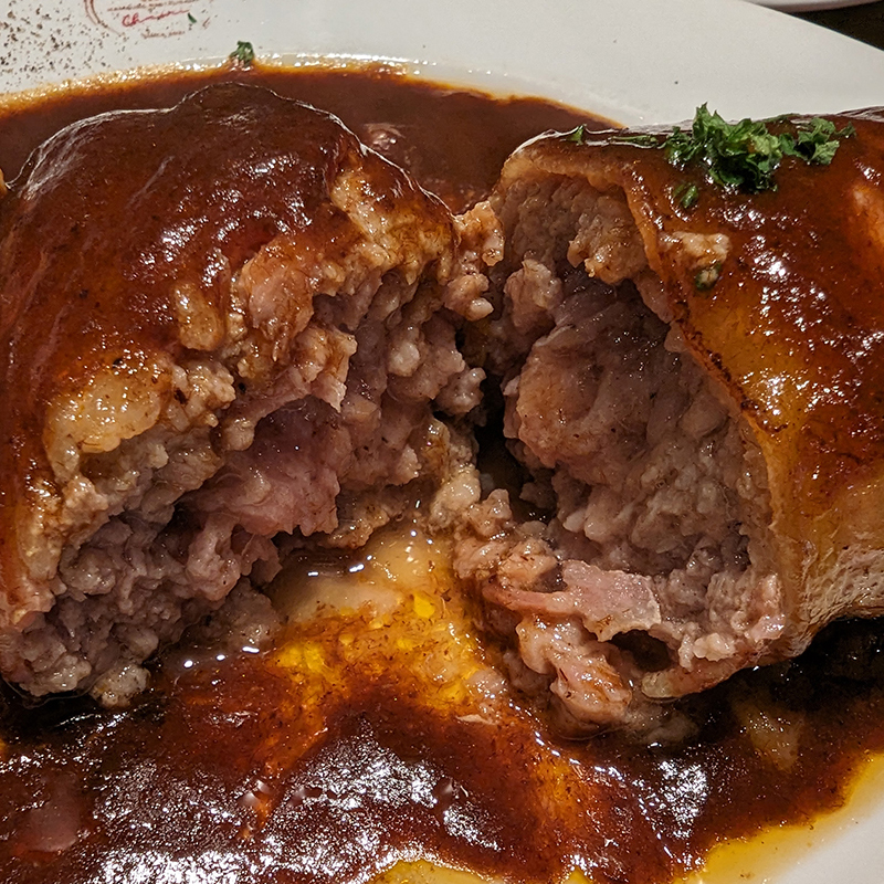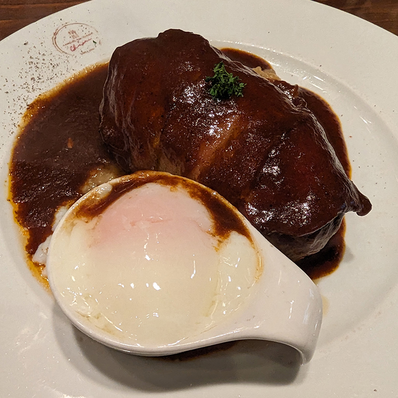 牛肉ではないので味わいは軽めの印象。中心部はややレアの仕上がり。ナイフを入れると肉汁が溢れる。今回ソースはドミグラスソースをお願いしたのだが、このソースがしっかりとコクがあってバランス良くなかなかの出来映え。