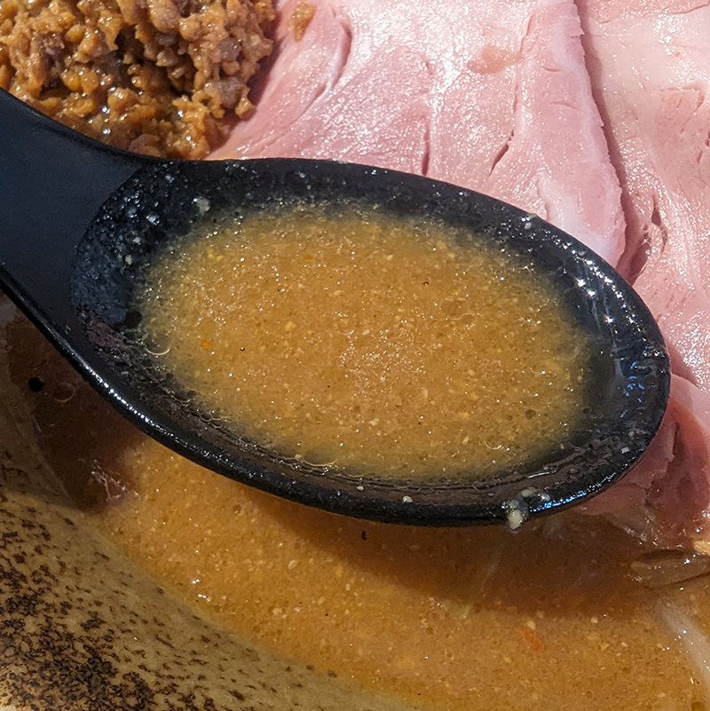 スープはしっかりとコクがあり濃厚な味わい。ラードが溶け込んでいると思われるが、最後まで熱々で頂けるので寒い日には心底温まる。