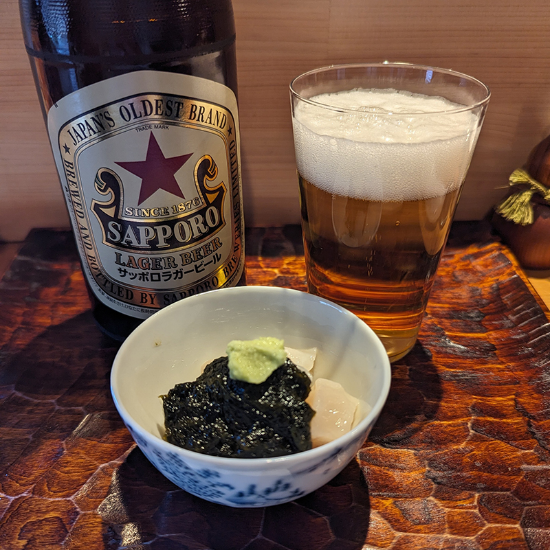 まずはビールとお通しとして供された帆立と生海苔を。帆立の鮮度もよく快適なスタート。