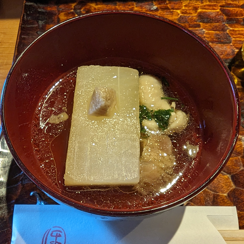 盛合せのひと品目は大根と牛すじ、お麩のお椀。牛すじが柔らかく優しい味わいで大根にも出汁の旨味が染みている。