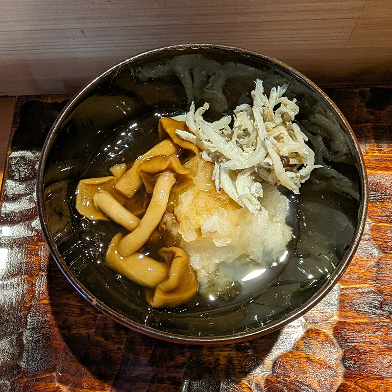 盛合せもひと品ずつ出てくるのがいい。ここからは単品メニューの料理が供される。こちらはなめととしらすのおろし。