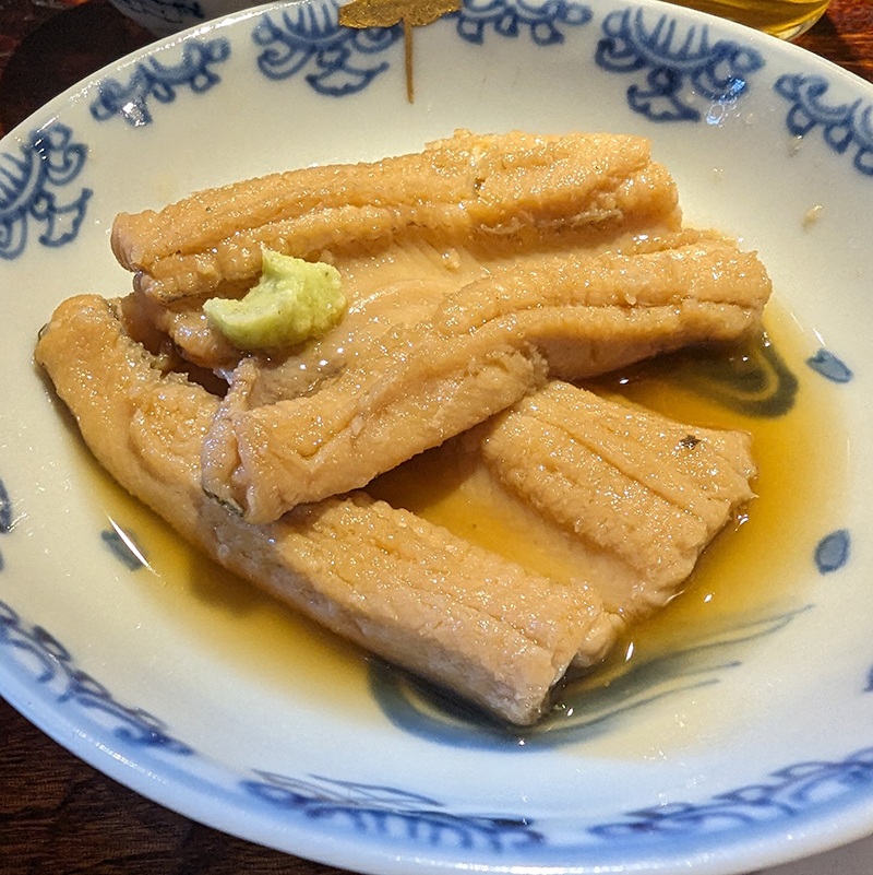 煮穴子はこれまでの山椒風味とは違いうす味の煮込みに仕上げている。この後の料理とのバランスを考えてのことか、上品な仕上がり。
