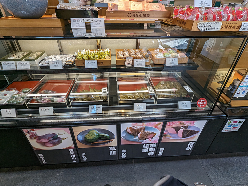 ショーケースを見ると各種桜餅に目移りし、今回はこごめ大福は見送った。他に赤飯ととらが焼きを購入。