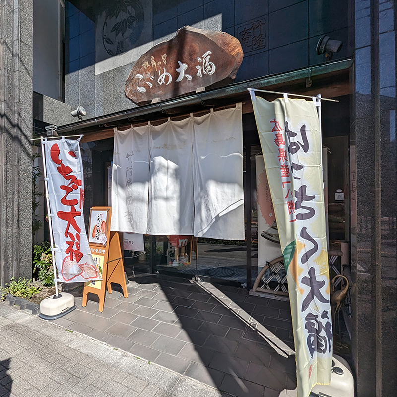 自動ドアが完備された立派な店舗で、看板にも書かれているこごめ大福が名物。