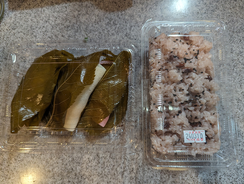 道明寺と普通の桜餅では道明寺に軍配。赤飯は可もなく不可もない。