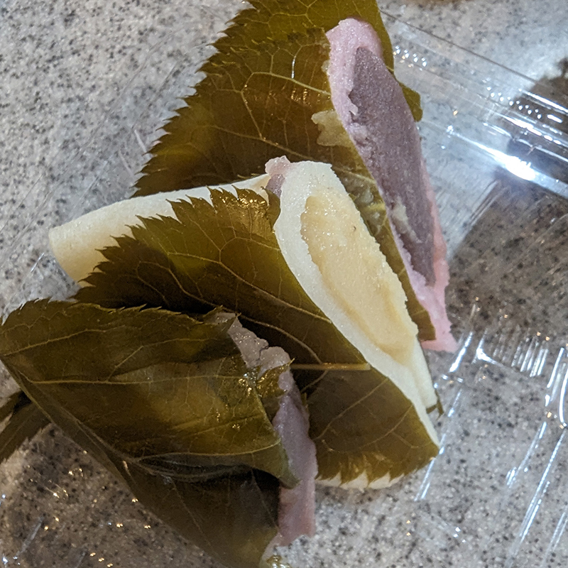 桜餅は左から道明寺と白い桜餅、桜餅の順。特に味噌のこし餡を使った桜餅は珍しい。