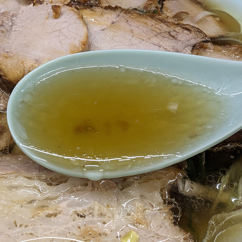スープは透明度が高く、醤油の色はかなり薄い。実際に頂いてみると塩気は強くやや塩っぱめ。全体のバランスは悪くない。