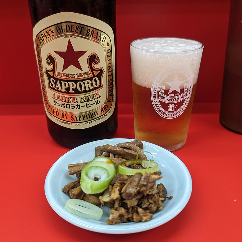 まずはビールを。自分で冷蔵庫から取り出し栓を抜くセルフサービス。お通しにチャーシューの切り落としとメンマを出してくれるのは嬉しい。