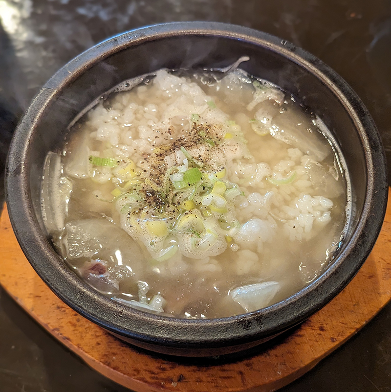 いい豚の骨が手に入ったとのことで作って頂いた。スープはテジクッパのスープがベースになっているので美味しい。辛さは控えめでマイルドなテイスト。最後は雑炊で頂く。