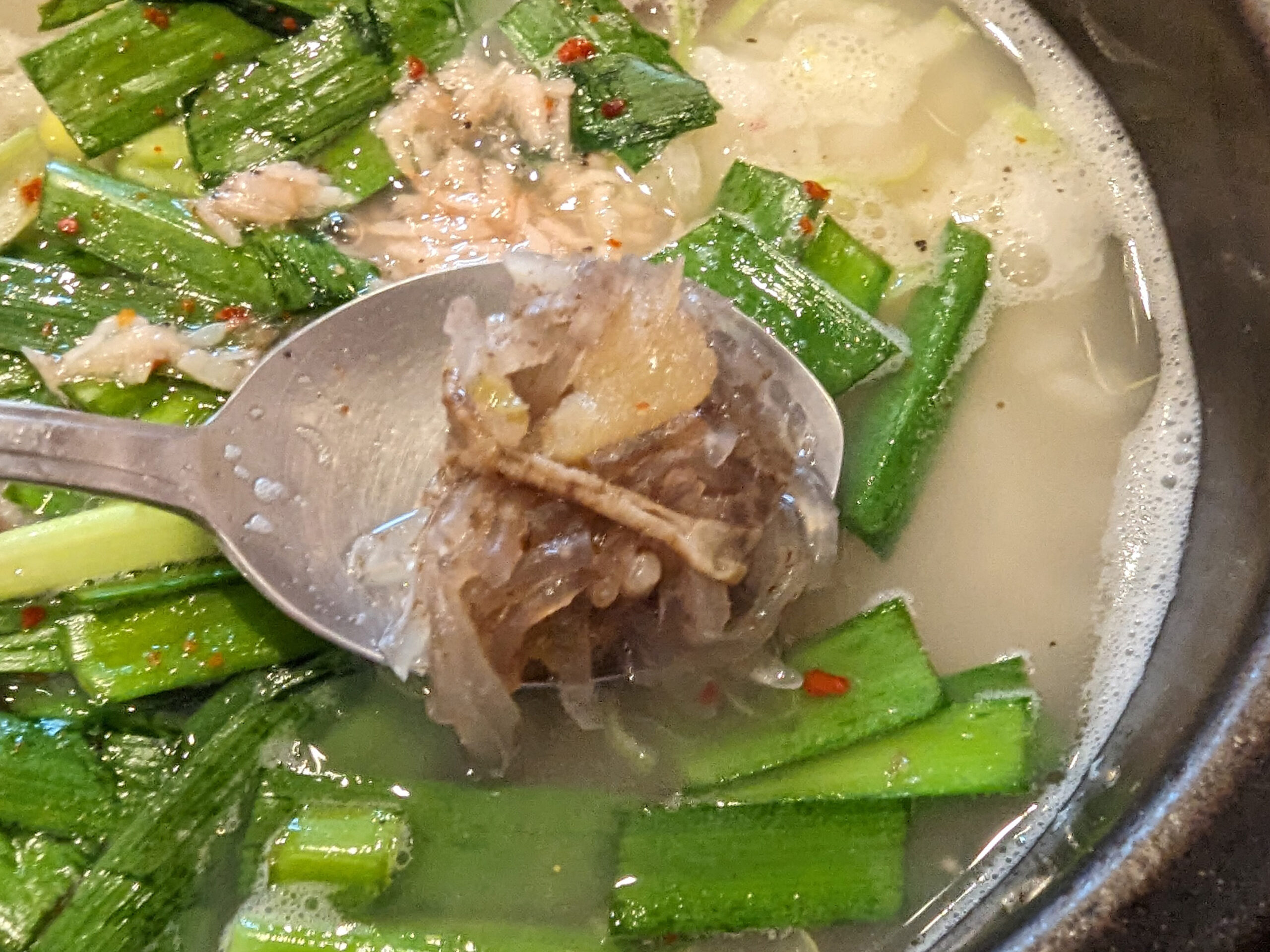 スンデは八角が香るので好みは分かれるかも知れないが、ゼラチン質が多くテジクッパのスープにはよくマッチしている。何よりこのスープが秀逸。