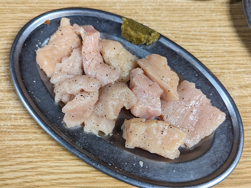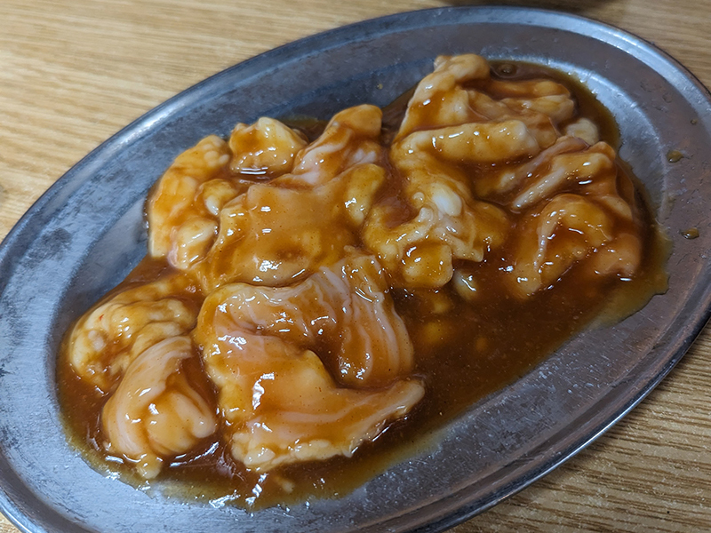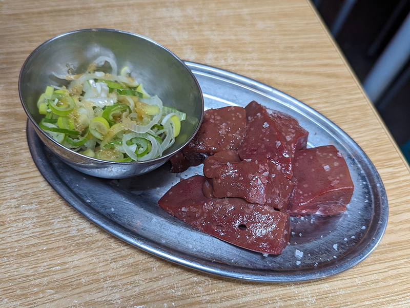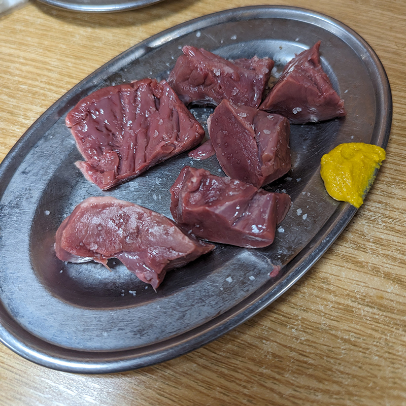 こちらは和からしで頂く。こちらも白レバー同様、素材の新鮮さを感じさせる。少し弾力性のある食感で白レバーと共に外せないひと品。