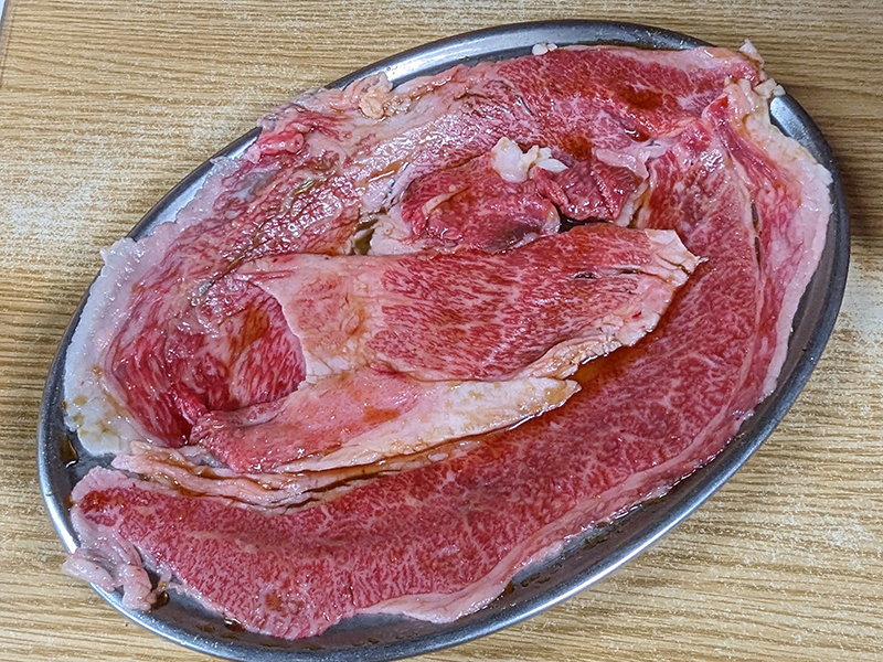 カルビに比べるともっさりと感じられる。玉子を付けてすき焼き風に頂く。