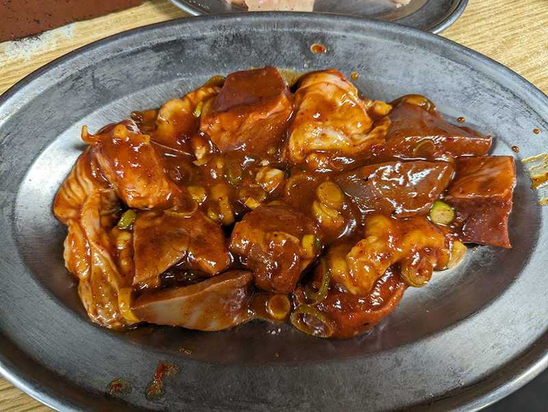 まったりとコクがあって旨い。添えられたネギとごま油で頂く。どのホルモンにも言えることだが、臭みはまったく感じられない。