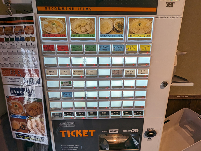 店内に入って券売機で食券を購入。メニューは醤油ラーメン、油そば、つけめん、塩ラーメンと並ぶ。塩ラーメンが離れた位置にあるのも面白い。