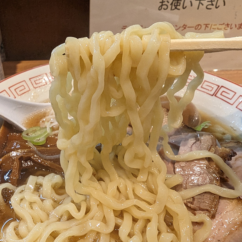 平打の縮れ麺はやや柔らかめの茹で加減だが、もっちりとした食感でスープともよくマッチしている。