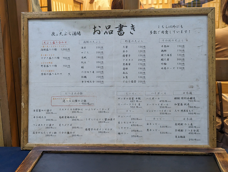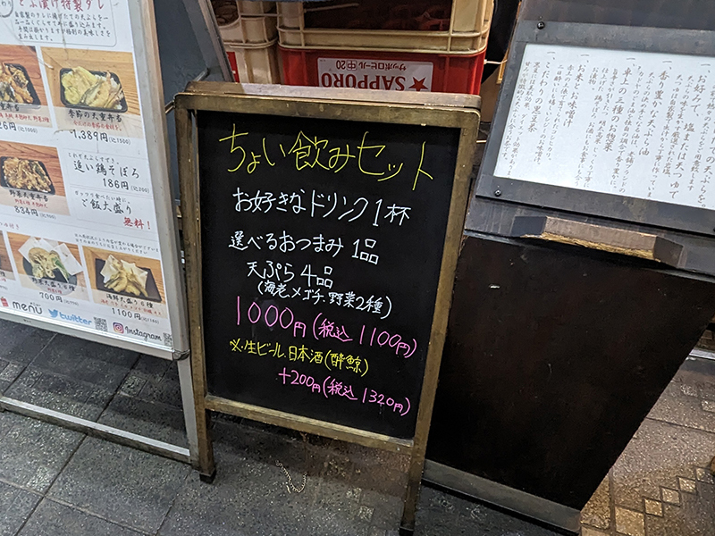 今回は食べたいネタが選べないので単品で注文したが、軽く飲むならおつまみ1品に天ぷら4品にドリングが付いたちょい飲みセットがお得。