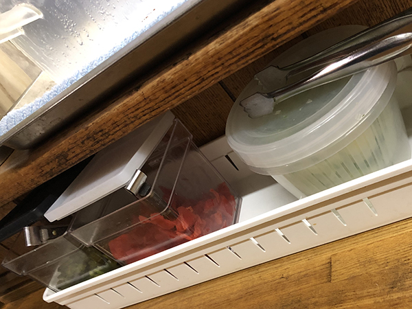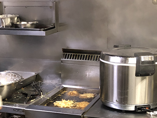 続いて、海鮮かき揚げを油の中に投入。通常のかき揚げは具材を粉と合わせてから油に投入されるが、海鮮は冷凍してあるものを直接投入するようだ。