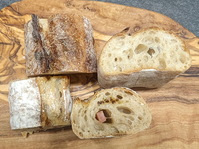 マスタードとベーコンのパンは今年フランス研修で覚えたレシピを再現した初公開のパン。粒マスタードとグリュイエールチーズの酸味が独特で個性的。