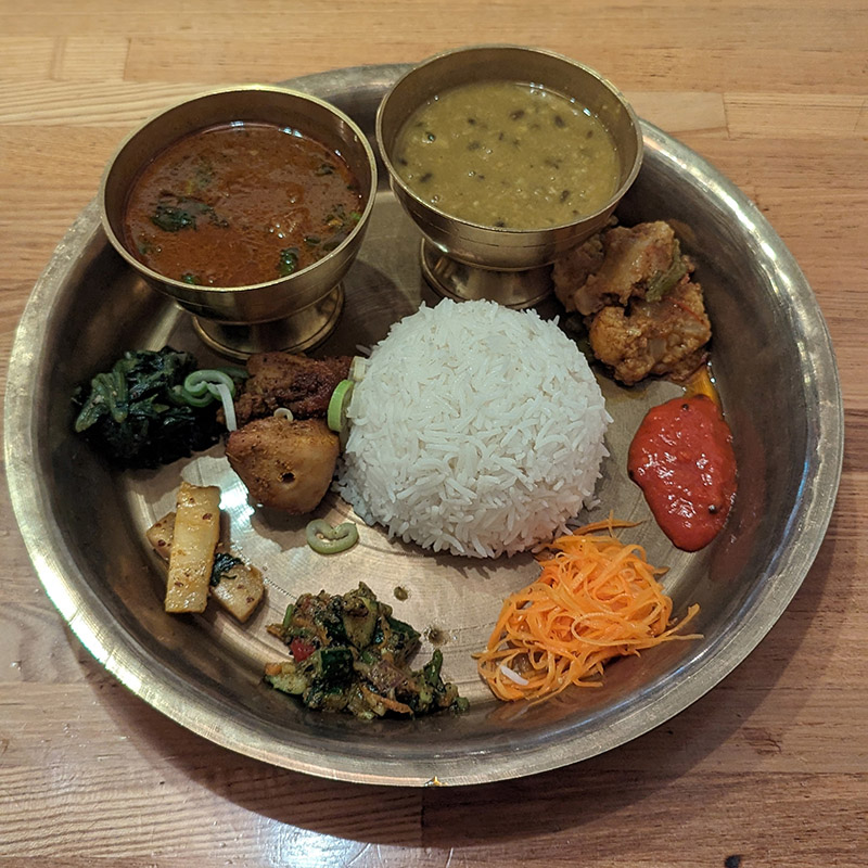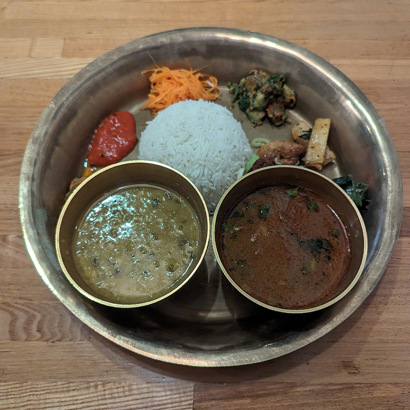 カレーにはマトンを選択。ダルバートというくらいなので主役は豆のかけ汁。プレートにはタルカリというおかずやアツァールという漬物類が並ぶ。スパイスが効いたものや酸味がアクセントになったものなどバラエティに富んでいる。野菜中心なのでとてもヘルシー。