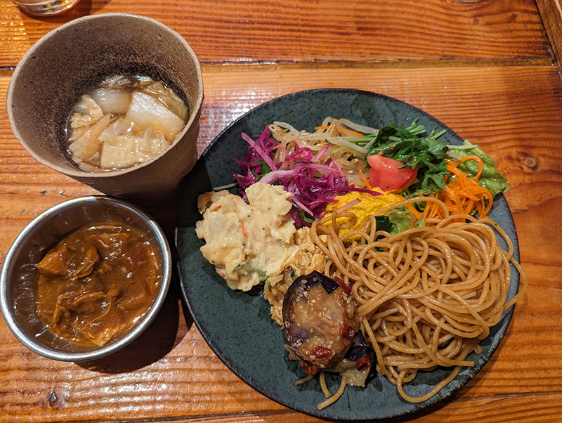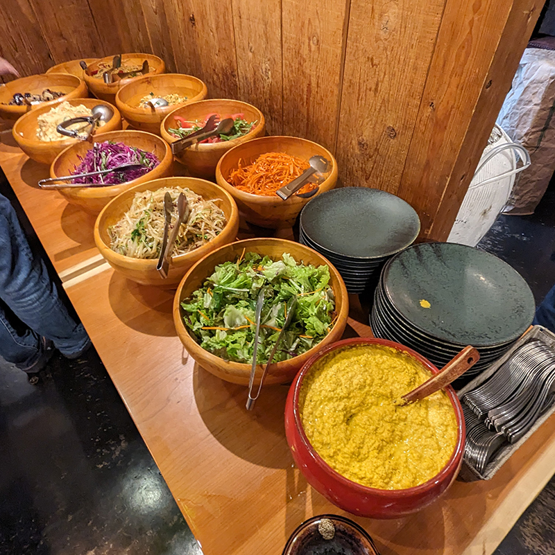 圧巻はサラダ―バー。野菜の種類が多いのはもちろんだが、手作りのドレッシングや煮込み料理や炒め物に至るまで手の掛かった料理が多い。更に野菜以外にもやきそばやカレーのルーまで揃っているのだから恐れ入る。ただし、食べ残しは厳禁なので注意が必要だ。