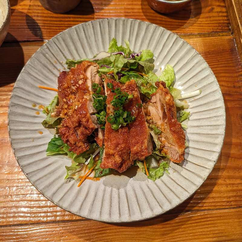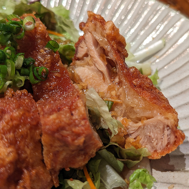 大ぶりの腿肉をじっくりと時間を掛けて丹念に揚げていく。それだけに麺類などに比べて提供時間は掛かるのだが、待つだけの価値はある。