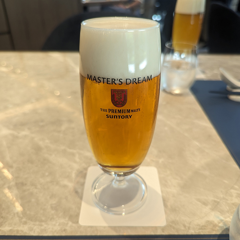 料理は坦々麺のセットなど、麺類やごはん類、コース料理などが用意されている。今回は事前に料理を予約していたので席に付いて出されるのはドリンクのメニューのみ。まずはビールを。