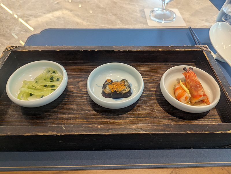 左から茎レタスのネギオイル掛け、上海蟹の黒酢煮こごり、才巻海老の麹漬け。どれも上品な味付けでこの後の料理にも期待が膨らむ内容。特に上海蟹の黒酢煮こごりは上海蟹の濃密な香りが楽しめる逸品。